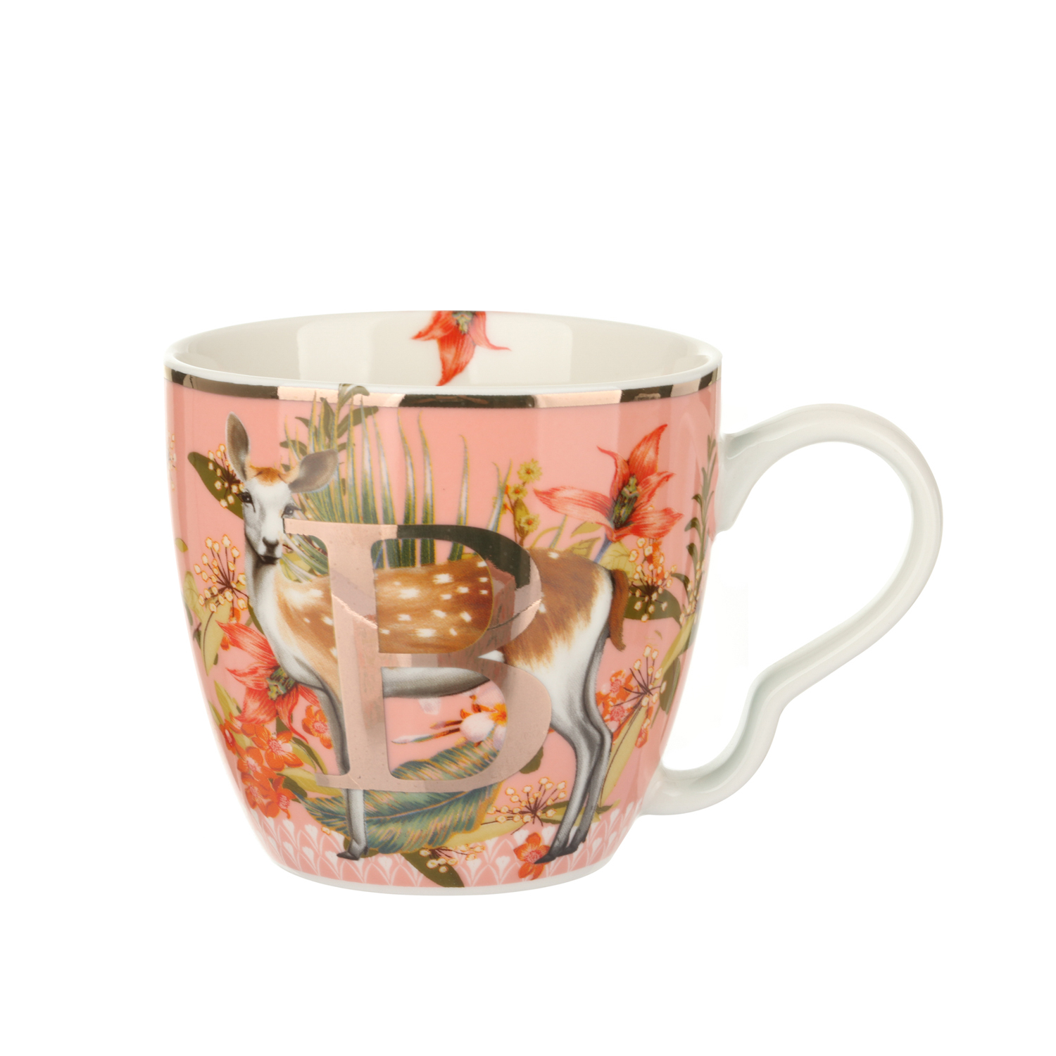 Rendi unica la tua mise en place con questa tazza in finissima porcellana dall'esclusivo decoro. La tazza, infatti, è caratterizzata da una lettera dorata su uno sfondo colorato, impreziosito da un motivo floreale e da un animale abbinato alla lettera. Scegli la tua iniziale e gusta le tue bevande in una tazza bella e originale. Perfetta per personalizzare ogni posto a tavola, puoi anche usarla come simpatica idea regalo grazie anche alla graziosa scatola in cui viene confezionata. Con capacità 48 cl, può essere comodamente lavata in lavastoviglie senza temere di rovinare il colorato decoro. Dimensioni: 14,5x9,5x10 cm.