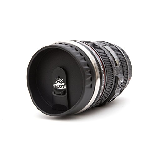 Tazza Teleobiettivo da Viaggio STRATA CUPS da 400 ml + 2 COPERCHI + CUCCHIAIO - Mug Termica per Caffè in Acciaio Inossidabile a Forma di Obiettivo di Fotocamera Reflex, Regalo Originale per Fotografo