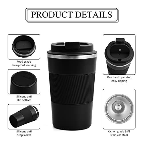 Tazza Termica 380ml Tazza da Viaggio per Caffe con Coperchio a Prova di Perdite Tazza da Viaggio in Acciaio Inossidabile Tazza di Caffè Riutilizzabile per Caffè Caldo e Freddo, Latte e tè, Nero