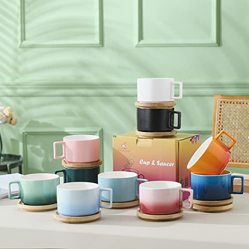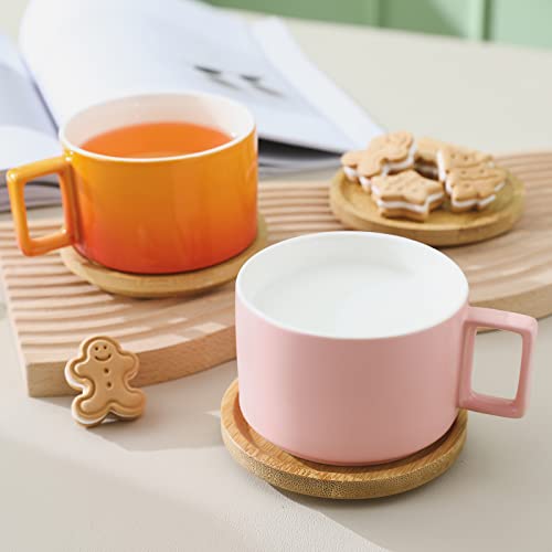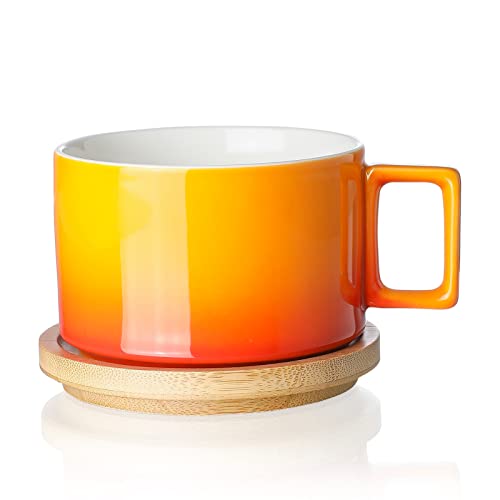 Set Tazze da Caffe Cappuccino con Piattino in Legno(310ml), Candiicap Tazzine da Caffè in Ceramica per Cappuccino, Latte Macchiato, Espresso, Americano, Tè (Arancio Tropicale)
