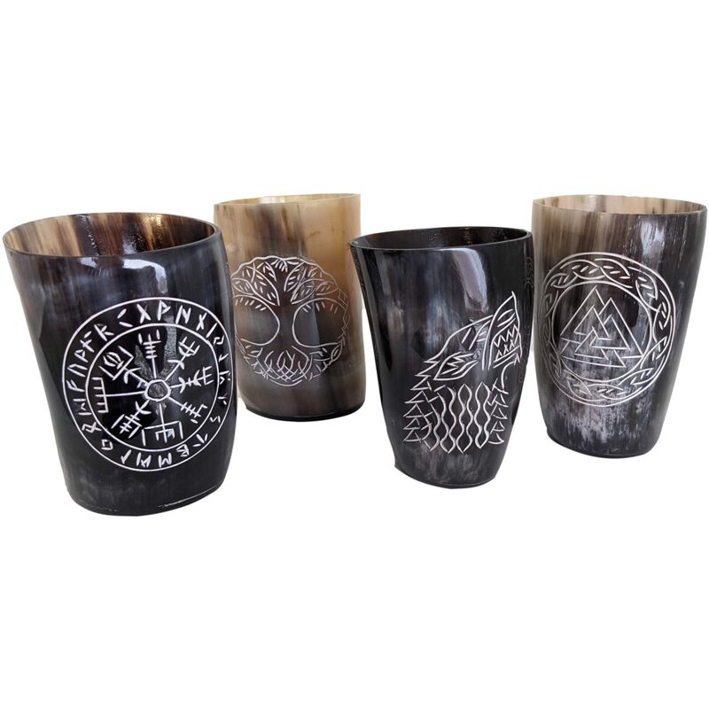 Hornerey Set di bicchieri in corno vichingo, corno di bufalo, 200 ml. Set di bicchieri in corno vichinghi, con incisioni, circa 0,2 l
