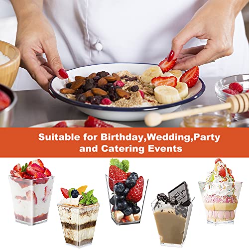 Confezione: 50 tazze da dessert riutilizzabili e 50 cucchiai, apertura della tazza: 6 * 6 cm, altezza: 7,5 cm, tazza da terra: 4 * 4 cm, capacità: 160 ml, impilabili per una facile conservazione e risparmio di spazio.