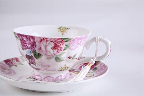 Set di 4 tazze da tè in porcellana con piattino, stile shabby chic, vintage, con motivo di uccelli, farfalle e fiori, con confezione regalo, Ceramica, Uccello rosa farfalla, 11x8cm
