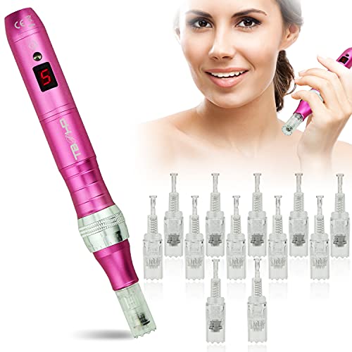 TBPHP P10 Dermapen Microneedling con Schermo LCD Derma Pen, Incl. 12 cartucce, ricaricabili, anti-invecchiamento, rimozione delle rughe, rassodamento della pelle, acne e cicatrici(Rosa)