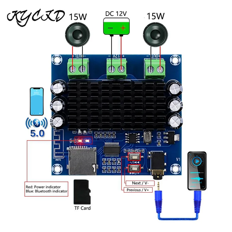 TDA7297 Bluetooth 5.0 Digital Amplifier Board 15W*2 Stereo Audio AMP Support TF Card 3.5mm AUX Jack For Speakers XH-A272