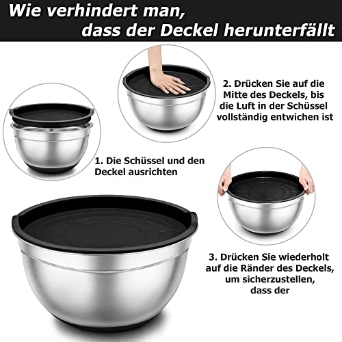 Fondo in silicone antiscivolo: ogni ciotola in acciaio inox è dotata di un fondo in silicone che non solo impedisce al pavimento di graffiare la superficie di lavoro, ma garantisce anche stabilità durante la miscelazione, l'impastatura o la miscelazione dei cibi, è possibile mescolare facilmente tutti i vostri ingredienti e cibi preferiti, senza preoccuparsi che la ciotola oscilli durante l'uso