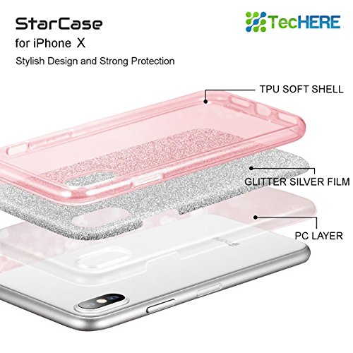 TecHERE StarCase - Custodia Morbida con Brillantini Glitter per Apple iPhone X XS - Cover di Alta qualità in Silicone Gel con Pellicola Protettiva Proteggischermo Inclusa (Rosa)