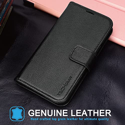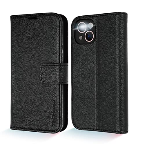 TECHGEAR Cover Portafoglio iPhone 13 Custodia in Pelle Vera, [RFID Blocking] Funzione di Supporto con Slot per Schede e Cinturino da Polso per iPhone 13 (6.1 Pollici, 2021) - Nero