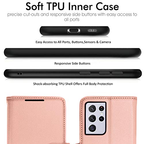 TECHGEAR Custodia in Pelle Galaxy S21 Ultra, Cover Libro Protettiva con Slot per Schede, Supporto e Cinturino da Polso - Pelle Sintetica per Samsung Galaxy S21 Ultra 5G Cover Portafoglio (Oro Rosa)