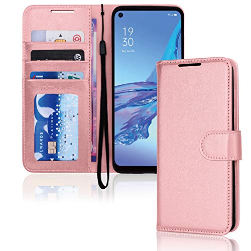 TECHGEAR Pelle Cover Oppo A32 / A53 - Custodia Portafoglio in Pelle Sintetica e TPU Antiurto, Funzione di Supporto con Slot per Schede e Cinturino da Polso per Oppo A32 / A53 - Oro Rosa