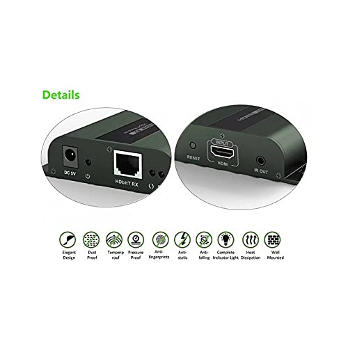 Extender-Set HDbitT con HDMI · HDbitT protocollo di trasmissione: · Risoluzioni supportate: 480i, 480p, 576i, 576p, 720p, 1080i, 1080p · Cavo di rete: UTP/STP CAT. 5E/6 · Dei percorsi di trasmissione fino a 120 m e fino a 1080p / 60Hz Full HD con un solo cat. 6 cavi · Segnale a infrarossi: supporta dispositivi a infrarossi 20-60KHz · Temperatura di esercizio: 0°C - 60°C · Alimentazione elettrica DC5V / 1A (alimentatore incluso) · Consumo: 3,5 W trasmettitore · Ricevitore: