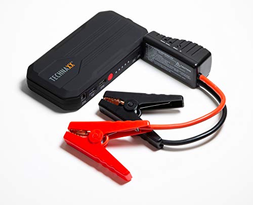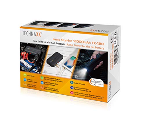 Technaxx Jump Starter 12000mAh TX-120 - Avviatore batteria auto con morsetti, luce LED integrata, con due porte USB di ultima generazione e con funzione Powerbank