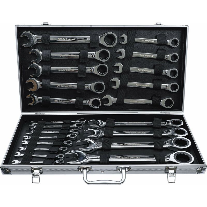 In valigetta in alluminio con bordi rinforzati. Cricchetto a denti fini, 72 denti. Angolo di regolazione extra basso 5°. Finitura superficiale: cromata, lucida. Contenuto della confezione: Chiave combinata a cricchetto SW 6 mm. Chiave combinata a cricchetto SW 7 mm. Chiave combinata a cricchetto SW 8 mm. Chiave combinata a cricchetto SW 9 mm. Chiave combinata a cricchetto SW 10 mm. Chiave combinata a cricchetto SW 11 mm. Chiave combinata a cricchetto SW 12 mm. Chiave combinata a cricchetto SW 13 mm. Chiave combinata a cricchetto SW 14 mm. Chiave combinata a cricchetto SW 15 mm. Chiave combinata a cricchetto SW 16 mm. Chiave combinata a cricchetto SW 17 mm. Chiave combinata a cricchetto SW 18 mm. Chiave combinata a cricchetto SW 19 mm. Chiave combinata a cricchetto SW 20 mm. Chiave combinata a cricchetto SW 21 mm. Chiave combinata a cricchetto SW 22 mm. Chiave combinata a cricchetto SW 23 mm. Chiave combinata a cricchetto SW 24 mm. Chiave combinata a cricchetto SW 27 mm. Chiave