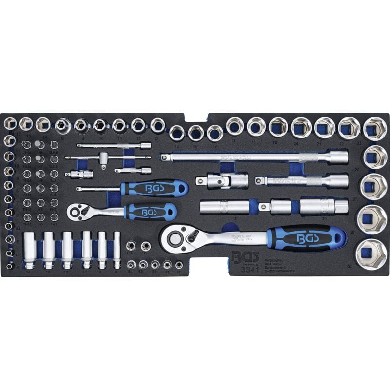 Adatto per valigetta con utensili assortiti 3312, 3318 Oggetto della fornitura: 1 cricchetto reversibile, dentato fine, con inserto a sgancio rapido Versione a gomito, 72 denti, 6,3 mm (1/4) 1 cricchetto reversibile, dentato fine, con inserto a sgancio rapido Versione a gomito, 72 denti, 12,5 mm (1/2) 1 impugnatura portabussole 150 mm, per 6,3 mm (1/4) 1 impugnatura scorrevole, 114 mm, per 6,3 mm (1/4) 1 adattatore per impugnature scorrevoli per prolunghe 12,5 mm (1/2) 7 inserti per bussole con profilo a E: Quadro interno 6,3 mm (1/4) E4 - E5 - E6 - E7 - E8 - E10 - E11 13 inserti per bussole, esagono Pro Torque®, Quadro interno 6,3 mm (1/4) 4 - 4,5 - 5 - 5,5 6 - 7 - 8 - 9 - 10 - 11 - 12 - 13 - 14 mm 17 inserti per bussole, esagono Pro Torque®, Quadro interno 12,5 mm (1/2) 10 - 11 - 12 - 13 - 14 - 15 - 16 - 17 - 18 - 19 - 20 - 21 - 22 - 24 - 27 - 30 - 32 mm 6 inserti per bussole, profondi, esagono Pro Torque®: Quadro interno 6,3 mm (1/4) 8 - 10 - 11 - 12 - 13 - 14 mm 6 portainserti