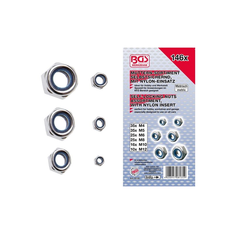Cromato- Stampa con inserto in nylon- Dimensioni: M4 ? 5 ? 6 ? 8 ? 10 ? 12Nel set Metrico con inserto in nylon In scatola assortita 35 dadi esagonali autobloccanti M4 35 dadi esagonali autobloccanti M5 25 dadi esagonali autobloccanti M6 25 dadi esagonali autobloccanti M8 16 dadi esagonali autobloccanti M10 10 dadi esagonali autobloccanti M12 Trattamento superficiale: cromato