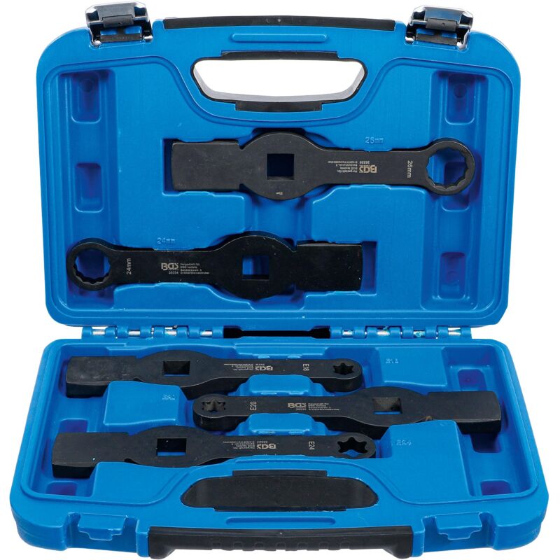 Per i collegamenti a vite delle pinze frenanti di veicoli commerciali Adatto per Mercedes-Benz, MAN, DAF Oggetto della fornitura: 1 chiave ad anello a percussione, poligonale, 24 mm (BGS 35334) 1 chiave ad anello a percussione, poligonale, 26 mm (BGS 35336) 1 chiave ad anello a percussione, Profilo E (per Torx) E18 (BGS 35318) 1 chiave ad anello a percussione, Profilo E (per Torx) E20 (BGS 35320) 1 chiave ad anello a percussione, Profilo E (per Torx) E24 (BGS 35324)