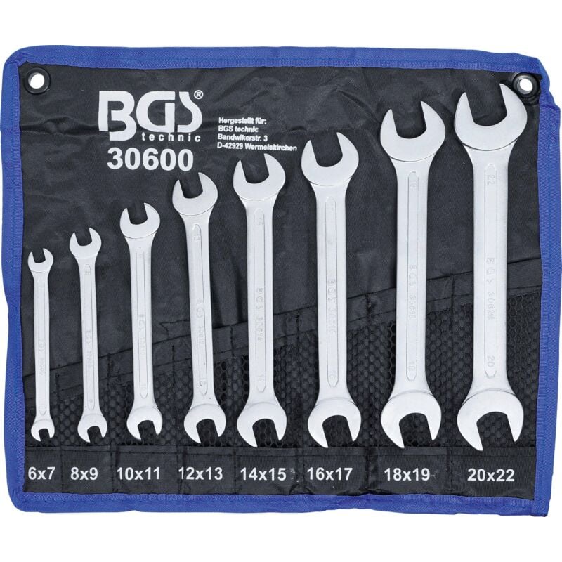 Fucinatura a freddo In borsa arrotolabile Tetron Oggetto della fornitura: 1 Chiave a forchetta doppia 6 x 7 mm (BGS 30606) 1 Chiave a forchetta doppia 8 x 9 mm (BGS 30608) 1 Chiave a forchetta doppia 10 x 11 mm (BGS 30610) 1 Chiave a forchetta doppia 12 x 13 mm (BGS 30612) 1 Chiave a forchetta doppia 14 x 15 mm (BGS 30614) 1 Chiave a forchetta doppia 16 x 17 mm (BGS 30616) 1 Chiave a forchetta doppia 18 x 19 mm (BGS 30618) 1 Chiave a forchetta doppia 20 x 22 mm (BGS 30620)