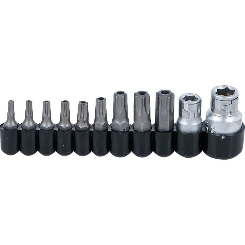 Oggetto della fornitura: 6 inserti, attacco esagono esterno 6,3 mm (1/4), profilo a T (per Torx) con foro T10 - T15 - T20 - T25 - T27 - T30 3 inserti, attacco esagono esterno 5/16, profilo a T (per Torx) con foro T40 - T45 - T50 1 adattatore inserti 6,3 mm (1/4) x quadrato interno 6,3 mm (1/4) 1 adattatore inserti 8 mm (5/16) x quadrato interno 10 mm (3/8)