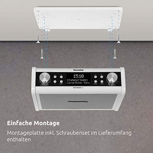 Contenuto della confezione: 1 x TechniSat DIGITRADIO 20 DAB+, alimentatore di rete (lunghezza = 1,80 m), antenna per lancio e accessori di montaggio (piastra adattatore con funzione di bloccaggio e set di viti), istruzioni (lingua italiana non garantita)