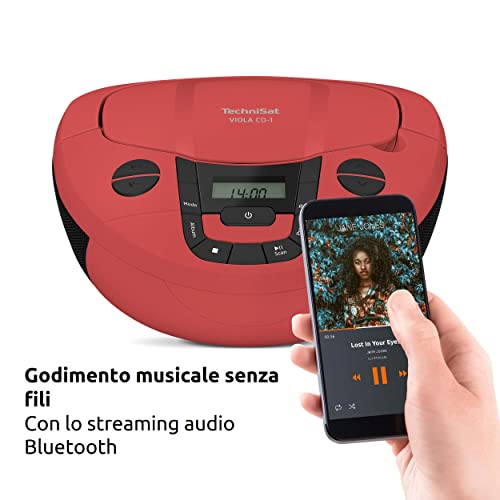 TechniSat VIOLA CD-1 - lettore CD stereo portatile con maniglia per il trasporto, boombox nera, sintonizzatore radio FM, ricezione Bluetooth, potenza di 2 x 1 W RMS, alimentazione a rete e a batteria