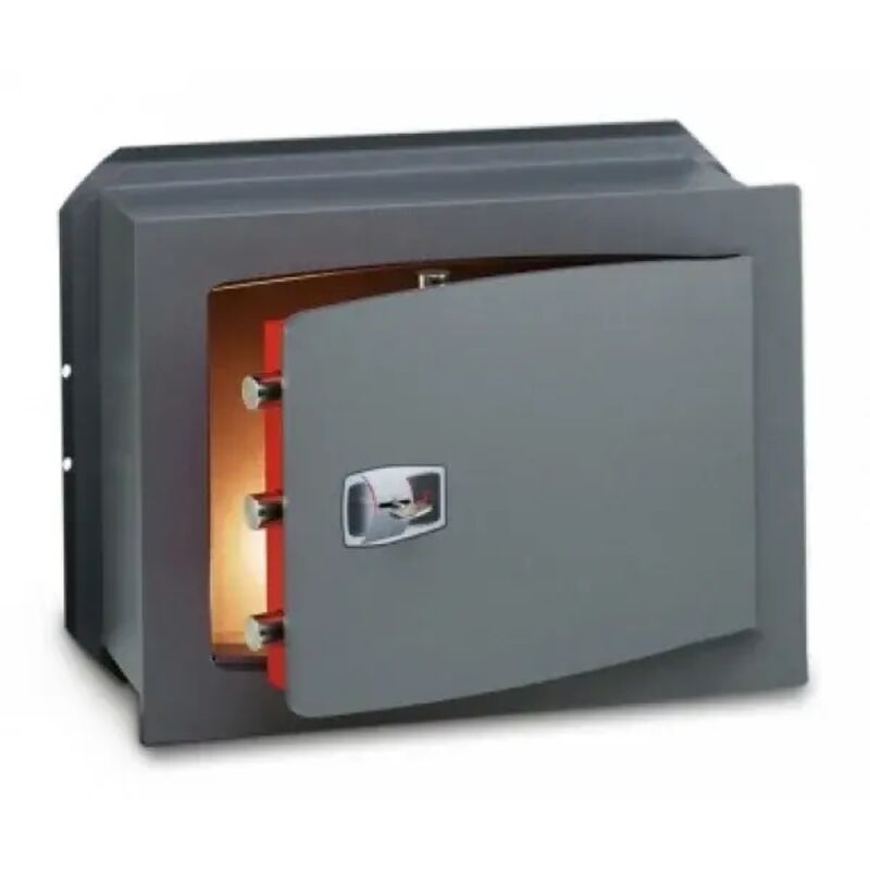 La cassaforte da muro Technomax appartenente alla serie Technofort Key è dotata con serratura di ultima generazione a 8 leve asimmetriche con certificazione UNI EN 1300.Questa cassaforte con chiusura a chiave grazie all'utilizzo di nuove leve antipicking oscillati e mentonnet a profilo speciale è estremamente resistente ai tentativi di scasso grimardelli o alri strumenti.Il comando di apertura è azionato da una chiave a doppia mappa, dublicabile solo se in possesso di carta di proprietà, estrabile solo a catenacci chiusi.Estremamente robusta la cassaforte Technofort Key è realizzata con catenacci girevoli in acciaio nichelato da 22 mm e protezione della serratura con resistente piastra in acciaio al manganese.Per garantire maggior resistenza questa cassaforte da murare ha speciali battute della porta testate per resistere più a lungo a tentativi di effrazione, inoltre le saldature sono realizzate con sistema robotizzato.I quattro lati sono dotati di alette di ancoraggio con funzione