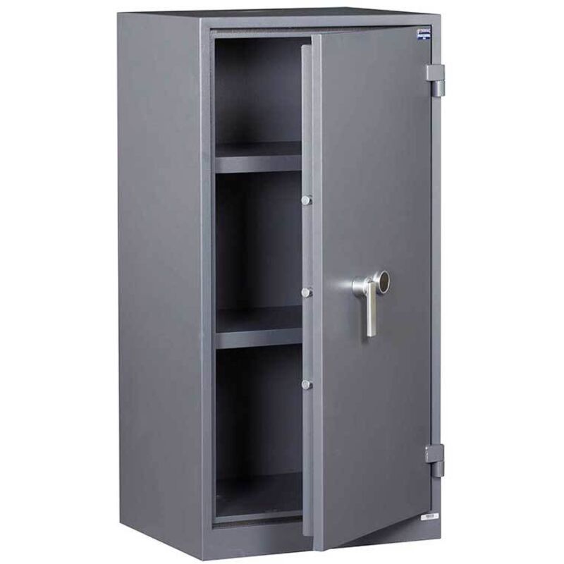 Armadio Blindato Con Combinazione Elettronica E Chiave A Doppia Mappa BLINDO Technomax L'armadio blindato con combinazione elettronica e chiave a doppia mappa è progettato per offrire un alto livello di sicurezza e protezione per i tuoi oggetti degni di valore. La sua struttura è realizzata in monoblocco a doppia parete, con uno spessore di 1 mm sia per la parete interna che per quella esterna. Questa costruzione a doppia parete contribuisce ad aumentare la resistenza dell'armadio contro tentativi di forzatura o scasso. Il battente dell'armadio ha uno spessore totale di 63 mm, garantendo una robustezza aggiuntiva. Questa caratteristica rende l'armadio particolarmente resistente agli attacchi fisici e agli strumenti di scasso. Inoltre, l'apertura delle porte a 180 gradi permette un facile accesso all'interno dell'armadio e agevola le operazioni di inserimento o rimozione degli oggetti. L'armadio è dotato di un sistema di chiusura avanzato, combinando una combinazione elettronica e una