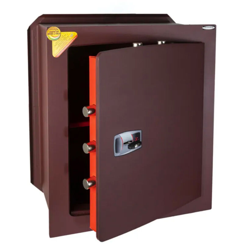 Cassaforte a muro della Technomax “Master Key” modello KM/7 Caratteristiche tecniche: Serratura di alta sicurezza di ultima generazione, con 8 leve asimmetriche ed indipendenti, certificata UNI EN 1300. Si basa sull'utilizzo di nuove leve antipicking oscillanti e mentonnet a profilo speciale che oppongono una eccezionale resistenza agli attacchi portati utilizzando gli ultimi sofisticati sistemi di manipolazione con l'uso di speciali grimaldelli es”attrezzo bulgaro”. Chiave a doppia mappa con profilo speciale duplicabile con carta di proprietà, per impedire la duplicazione non autorizzata delle chiavi. Estrazione della chiave impossibile a catenacci rientrati. Catenacci in acciaio nichelato, girevoli, del Ø di 22 mm. Protezione al meccanismo della serratura con piastra in acciaio al manganese. Speciali battute della porta per resistere più a lungo ai tentativi di effrazione con mazza. Robuste saldature interne realizzate con sistema robotizzato. Saldatura perimetrale del frontale al