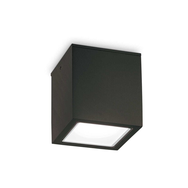 Collezione Techo PICCOLI CUBI ILLUMINANTI PER LA TERRAZZA Plafoniera per esterno a forma di cubo 15x15 cm. Corpo luce in alluminio pressofuso verniciato a polveri con finitura nero.. Diffusore in vetro temperato trasparente smerigliato. Attacco GU10 max 20 W.