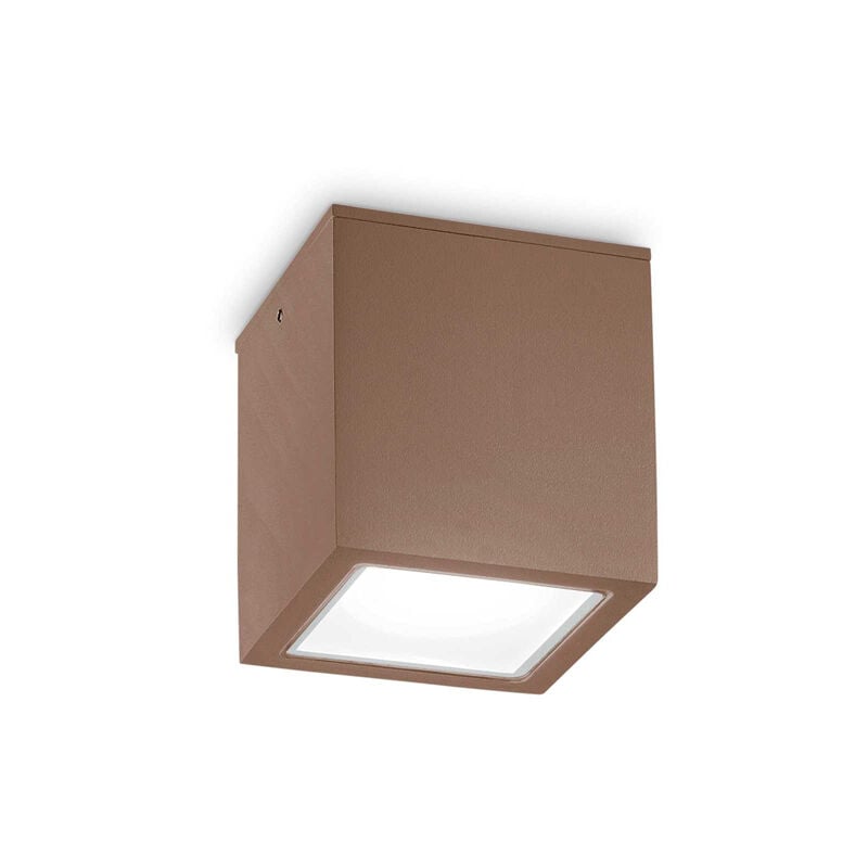 Collezione Techo PICCOLI CUBI ILLUMINANTI PER LA TERRAZZA Plafoniera per esterno a forma di cubo 15x15 cm. Corpo luce in alluminio pressofuso verniciato a polveri color coffee.. Diffusore in vetro temperato trasparente smerigliato. Attacco GU10 max 20 W.