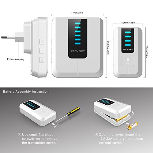 TECKNET Campanelli Senza Fili Impermeabile, Wireless Doorbell Esterno, Campanello Senza Fili con 52 Suonerie, Indicatori LED, 300M Operativo a Grande Distanza, 4 Volumi Selezionabili, Italia Spina