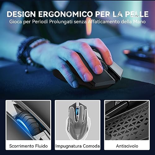 【Design Ergonomico Avanzato】Il gaming mouse è sagomato ergonomicamente per adattarsi comodamente al palmo della tua mano. La forma ergonomica aiuta a ridurre l'affaticamento della mano durante le lunghe sessioni di gioco, offrendo l'esperienza di gioco più confortevole. Questo mouse wireless è compatibile con i sistemi Win10/Win8/Win7/Vista/XP/MAC.