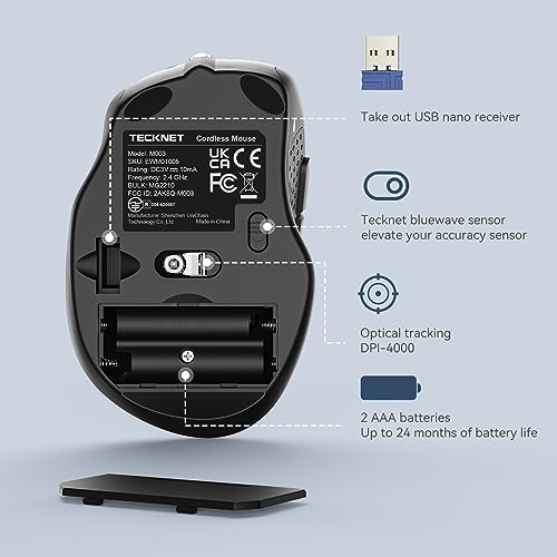 Mouse per computer da 2,4 GHz: il mouse cordless TECKNET garantisce una connessione affidabile con una maggiore distanza di lavoro fino a 15 m ed elimina ritardi, interruzioni e interferenze. Un mouse ergonomico con una forma sagomata e una morbida impugnatura in gomma garantiscono un comfort tutto il giorno.