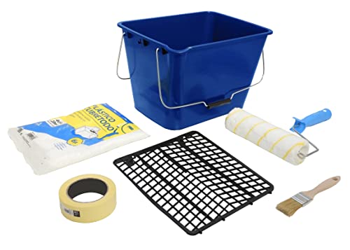 Composto da: 1 vaschetta 16 litri con griglia 1 rullo antigoccia 22 cm 1 pennello in legno 30 mm larghezza 1 copertura 4 x 5 m 1 nastro da pittore 36 mm