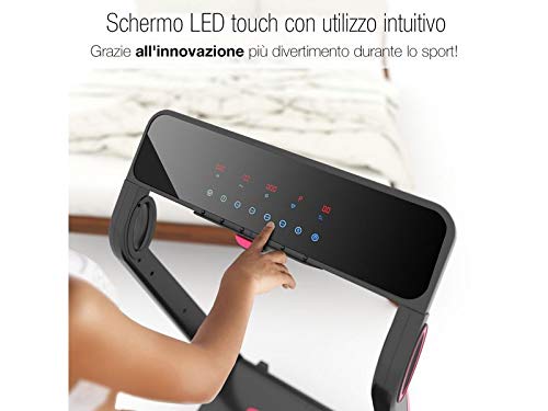Nastro di corsa di 42 cm x 115 cm per facilitarne l'uso in corsa Inclinazionepreimpostata Nastro ortopedico da 1,8 mm Potente motore da 2.5 hp Cuscinetti rulli alta qualità 1-12 km/H con incrementi di 0,1 km/h