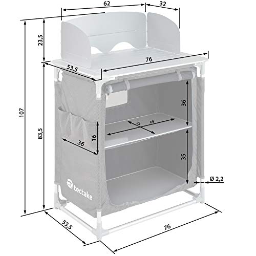 Compatta, robusta, versatile: la cucina da campeggio di TecTake ha con poco ingombro molto da offrire // Dimensioni totali (largh. x prof. x h): ca. 76 x 53,5 x 107 cm // Portata: max. 30 kg (distribuzione uniforme del peso).