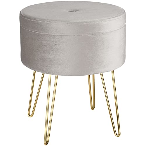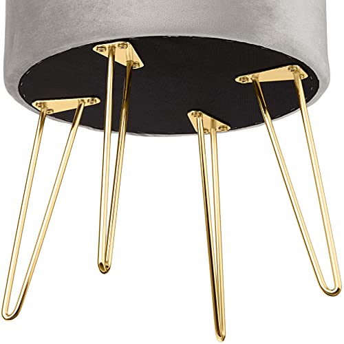 TecTake 800831 Sgabello Rotondo in Effetto Velluto, Grande Scomparto Interno, Gambe Color Oro in Filigrana Scintillante, Capacità Massima di Carico 300 kg (Grigio Chiaro)