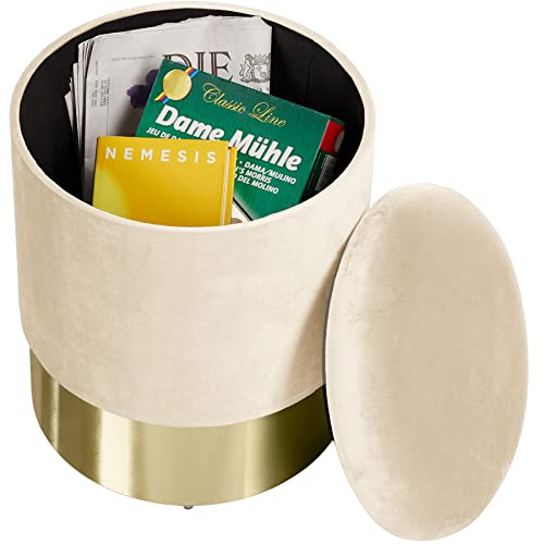 TecTake 800832 Sgabello Rotondo, Effetto Velluto, Grande Scomparto, Base in Acciaio Color Oro Scintillante, Capacità Massima di Carico 300 kg (Bianco Crema)