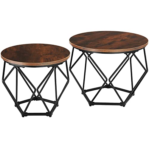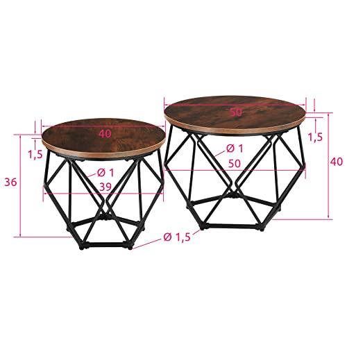 DETTAGLI PRODOTTO: Misure totali tavolino da divano piccolo (Ø x alt.): circa 40 x 36 cm // Misure totali tavolino da divano grande (Ø x alt.): circa 50 x 40 cm // Spessore del pannello in truciolato: circa 1,5 cm // Altezza regolabile dei piedi in plastica: circa 1 cm // Diametro del telaio in acciaio: circa 1 cm // Carico massimo di ciascun tavolino da divano: 20 kg.