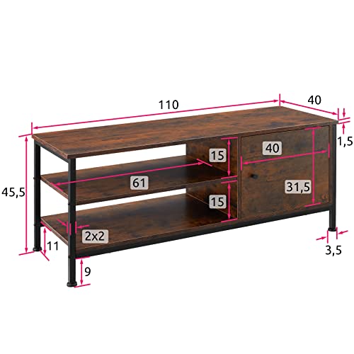 DETTAGLI PRODOTTO: Misure totali (largh. x prof. x alt.): circa 110 x 40 x 45,5 cm // Ripiani aperti (largh. x prof. x alt.): circa 61 x 40 x 15 cm // Misure interne scomparto con porta (largh. x prof. x alt.): circa 40 x 40 x 31,5 cm // Spessore del pannello in truciolato: circa 1,5 cm // Telaio in acciaio (largh. x prof.): circa 2 x 2 cm // Carico massimo del ripiano superiore: 50 kg // Carico massimo per ciascuno scomparto: 20 kg.