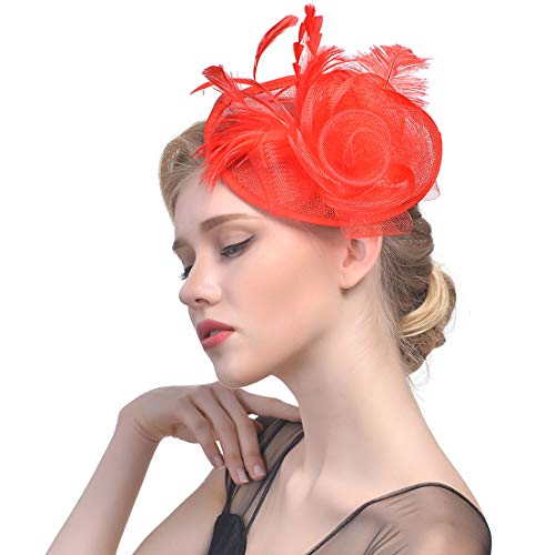 TEERFU Donna Elegante piuma Fiore e Veil Fascinator cocktail clip del cappello dei capelli del partito Taglia unica Rosso