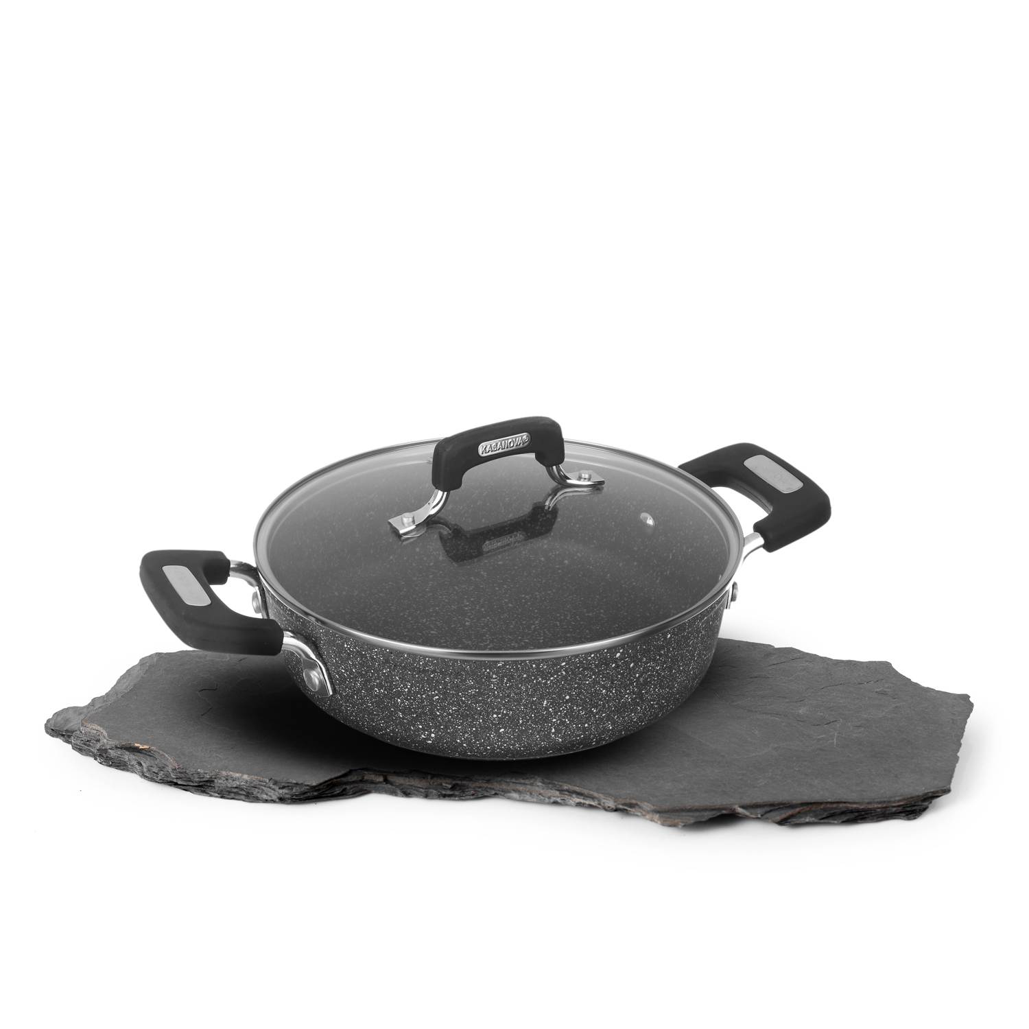 New Petra Dark è la linea cottura perfetta per il piano a induzione utilizzabile anche in forno fino a 180 °C, senza coperchio. Il nome è ispirato ai colori e alla durezza dei materiali che la compongono esaltandone il design accattivante e l'estrema resistenza. Grazie al rivestimento antiaderente 5 strati Greblon a base d'acqua, è ideale per cotture senza grassi aggiunti e rispettose dell'ambiente. Il fondo in acciaio full induction completamente piatto aderisce perfettamente al piano cottura e rende il tegame perfetto per l'induzione e adatto anche agli altri piani. Con manici rivestiti in silicone e coperchio in vetro. Privo di PFOA e nichel nel rivestimento, ma può contenerne in minima parte nel manico. Lavabile in lavastoviglie, ma per preservare l'antiaderenza si suggerisce il lavaggio a mano.