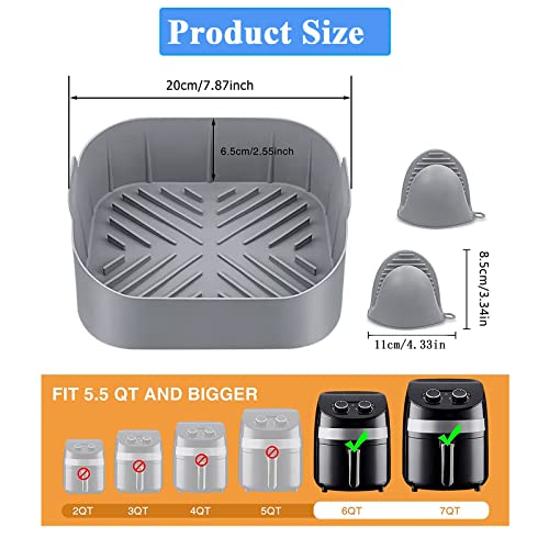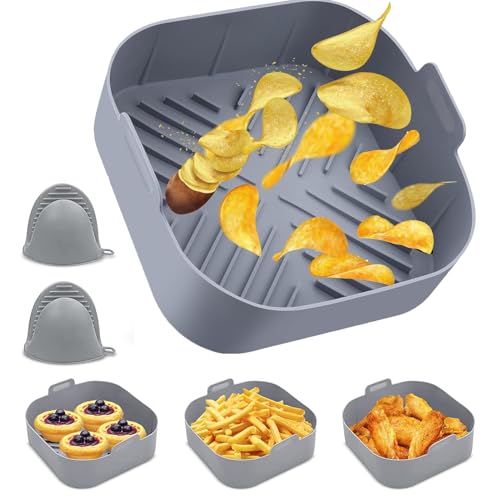 【Contenuto della confezione】: La confezione contiene 1 stampo per friggitrice ad aria calda in silicone grigio (dimensioni: 21 x 21 x 7 cm) e 2 guanti da forno in silicone con funzione antiscottatura. Proteggi le tue mani dalle ustioni quando rimuovi la padella in silicone e sono molto facili da installare e rimuovere. Allo stesso tempo, può anche impedire che la friggitrice venga danneggiata da residui di cibo e macchie di olio e non ne pregiudica la durata.