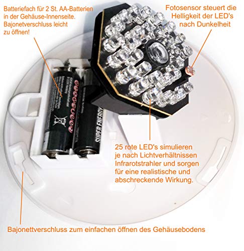 Telecamera Dummy con 25 LED rossi a infrarossi, finta con obiettivo, telecamera di sorveglianza, da parete, colore: bianco