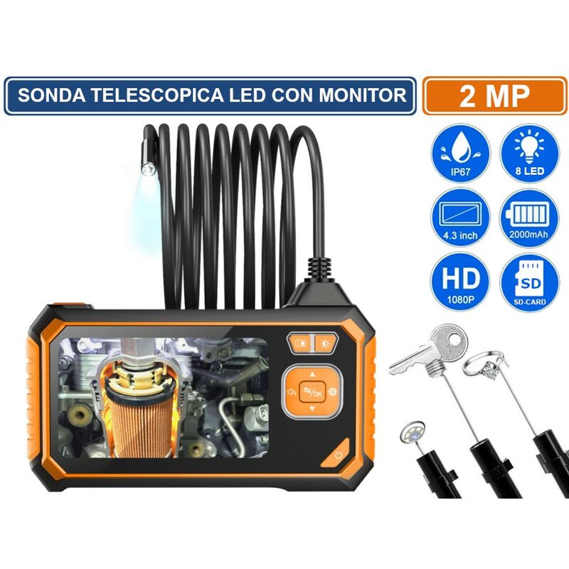 Questo endoscopio professionale "all-in-one" è uno strumento ideale per applicazioni pratiche come l'indagine dei componenti interni e/o condutture. Specificamente progettato con una sonda cavo da 5m alla cui estremità è posta una fotocamera ad alta definizione con risoluzione da 2MP (1920x1080). E' inoltre dotata di 6 led smd bianchi ultra luminosi che consentono l'utilizzo di questa sonda anche in totale assenza di luce. Il grado di impermeabilità IP67 rende questo prodotto idoneo all'utilizzo in presenza di liquidi Interruttore di retroilluminazione a LED Pulsante di acquisizione foto/video Regolazione della luminosità del LED Pulsante direzionale del menu verso l'alto Pulsante di accesso almenù Pulsante direzionale del menu verso il basso Pulsante di accensione/spegnimento Pulsante OK Tasto indietro Porta di alimentazione Indicatore di funzionamento a LED Porta per schede TF Principali Caratteristiche Schermo LCD a colori da 4,3 pollici Elevata risoluzione 1080P 2 Megapixel
