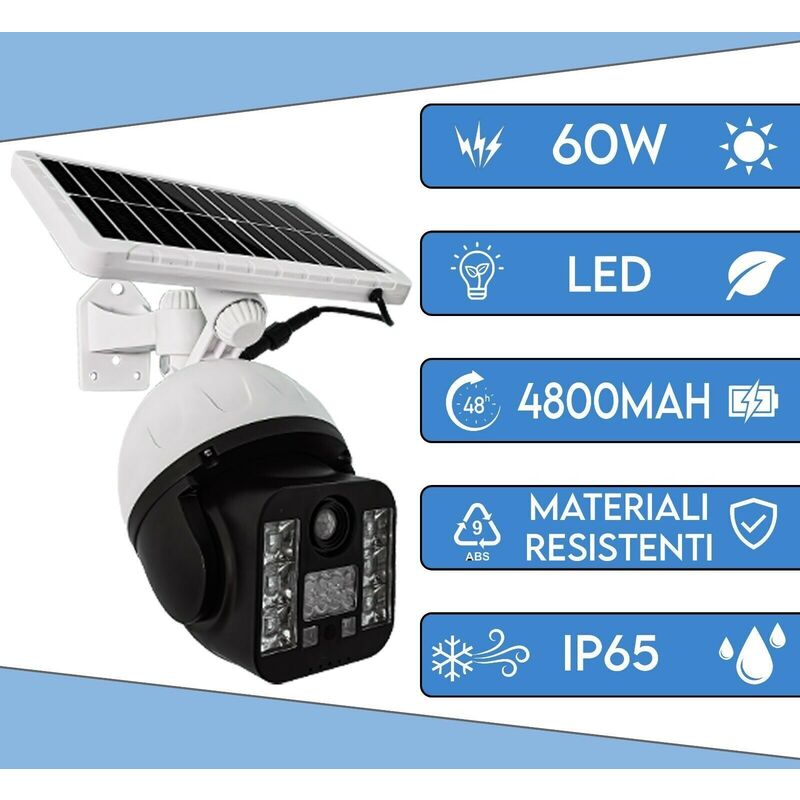 Telecamera finta sicurezza luce lampada solare con sensore di movimento 60w led Descrizione Luce solare led con pannello solare. Questa Lampada da esterno è molto luminosa e sprigiona 60W di potenza La sua conformazione fa si che possa essere molto simile a una telecamera di sorveglianza, perfetta per mettere paura a qualche malfattore che vuole intrufolarsi in casa. Infatti il potente sensore di movimento con la sua sensibilità è in grado di rilevare movimenti fino a 10 metri di distanza, consentendo così al faro di accendersi. Grado di impermeabilità ip65 resistente a pioggia ed eventi atmosferici. Potrai inoltre essere servito dalla luce prodotta dal pannello solare, questo perché la batteria contenuta all'interno della lampada è agli ioni di litio con una capienza di 4800mAh. con tanta efficienza Il pannello solare dovrà essere esposto alla luce diretta del sole permettendo alla batteria di ricaricarsi completamente Condizione Nuovo: Oggetto nuovo, non usato, non aperto, non