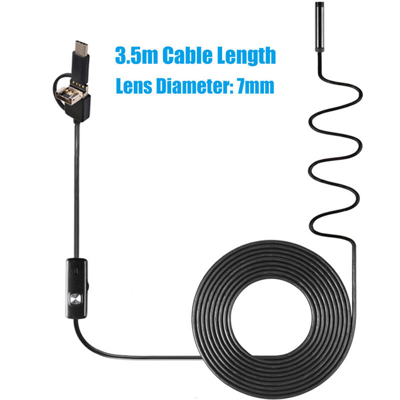 Questo endoscopio USB 3 in 1 è un dispositivo molto utile e pratico nella tua vita quotidiana perché può aiutarti a visualizzare luoghi che non possono essere osservati direttamente dagli occhi umani, in particolare ti aiuta a scoprire qualcosa che è caduto in un piccolo angolo o ispezionare i tubi, assemblaggio di attrezzature e minuteria. È uno strumento indispensabile e può essere utilizzato in diversi campi, come riparazioni auto, ispezione dell'aria condizionata, ispezione di tubi di sfiato/tubi dell'acqua/fognature/oleodotti, ecc. Specifiche: Lunghezza cavo: 1 m, 3,5 m, 5 m, 10 m (opzionale) Diametro obiettivo: 3,9 mm, 7 mm, 8 mm (opzionale) Sorgente luminosa della fotocamera: 6 LED regolabili Risoluzione: * 3,9 mm: 1280 * 720 * 7 mm: 640 * 480 * 8 mm: 1280 * 720 Fotogrammi al secondo: 30 fps < br /> Angolo di visione: 70° Livello di impermeabilità: IP67 Formato foto: JPEG /> Formato video: AVI Interfaccia: USB/Micro USB/Type-C Computer di supporto: per XP/Win7/Win8/VISTA