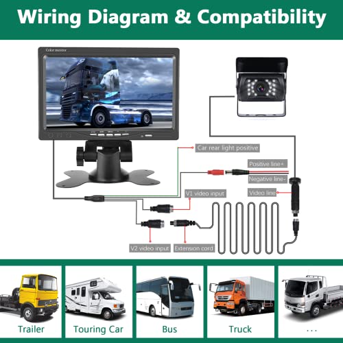 【Facile installazione e ampie applicazioni】Un cavo a 4 pin consente di alimentare e trasferire la telecamera con un singolo cavo. Ottieni la forza motrice della fonte di alimentazione dell'auto e della luce di retromarcia, che evita di indossare un caricabatterie aggiuntivo. Questo monitor con telecamera supporta l'alimentazione DC 12V - 24V, adatto per una vasta gamma di veicoli, come roulotte, camion, rimorchi, autobus e camper.