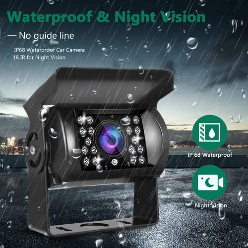 【Telecamera posteriore】 Fotocamera in metallo duro, impermeabile e resistente al fango. Puoi farlo funzionare a tempo pieno quando ti connetti a una fonte di alimentazione costante. 18 luci IR per la visione notturna, ampio angolo di visione orizzontale, ampio angolo orizzontale regolabile per vedere i punti ciechi. Con IP68 impermeabile, la telecamera per auto funziona bene con fendinebbia e fendinebbia durante la giornata di pioggia. Nota: nessuna linea guida.