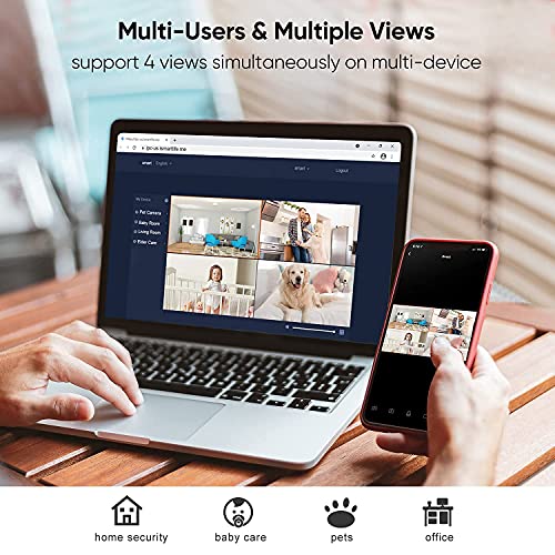 Audio a 2 vie e più viste condivise. La telecamera di sicurezza wifi built-in microfono e altoparlante anti-rumore, si può chiaramente sentire e parlare con la vostra famiglia ovunque. La fotocamera per animali domestici supporta più utenti (senza numero di account limite) per condividere le viste tramite app smartphone su iPhone e Android. Con 4 schermi di visualizzazione simultanei e 24/7 video live streaming, non perdere mai nessun momen