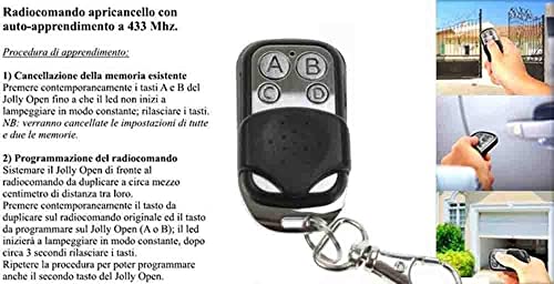 Il telecomando si programma facilmente, bisogna prima di tutto cancellare tutti i dati tenendo premuti contemporaneamente i tasti a e b per 20 secondi circa, fino al cambiare del lampeggio del led, dopo di che premete il tasto dal telecomanco sorgente che volete copiare e abbicinatelo al telecomando clonabile vicinissimo spalla a spalla, il segnale led differente vi indicherà l'avvenuta programmazione